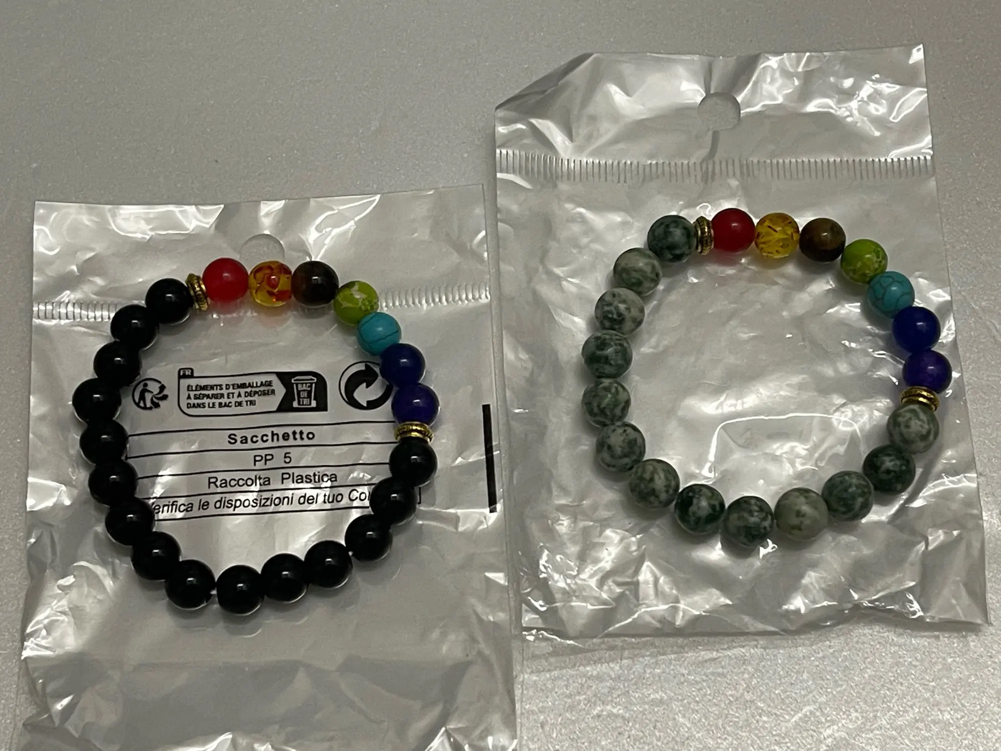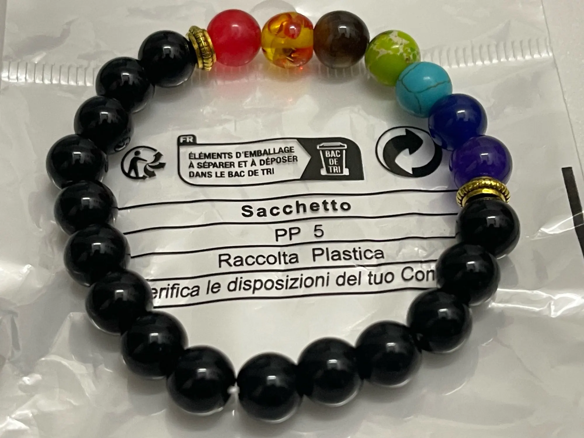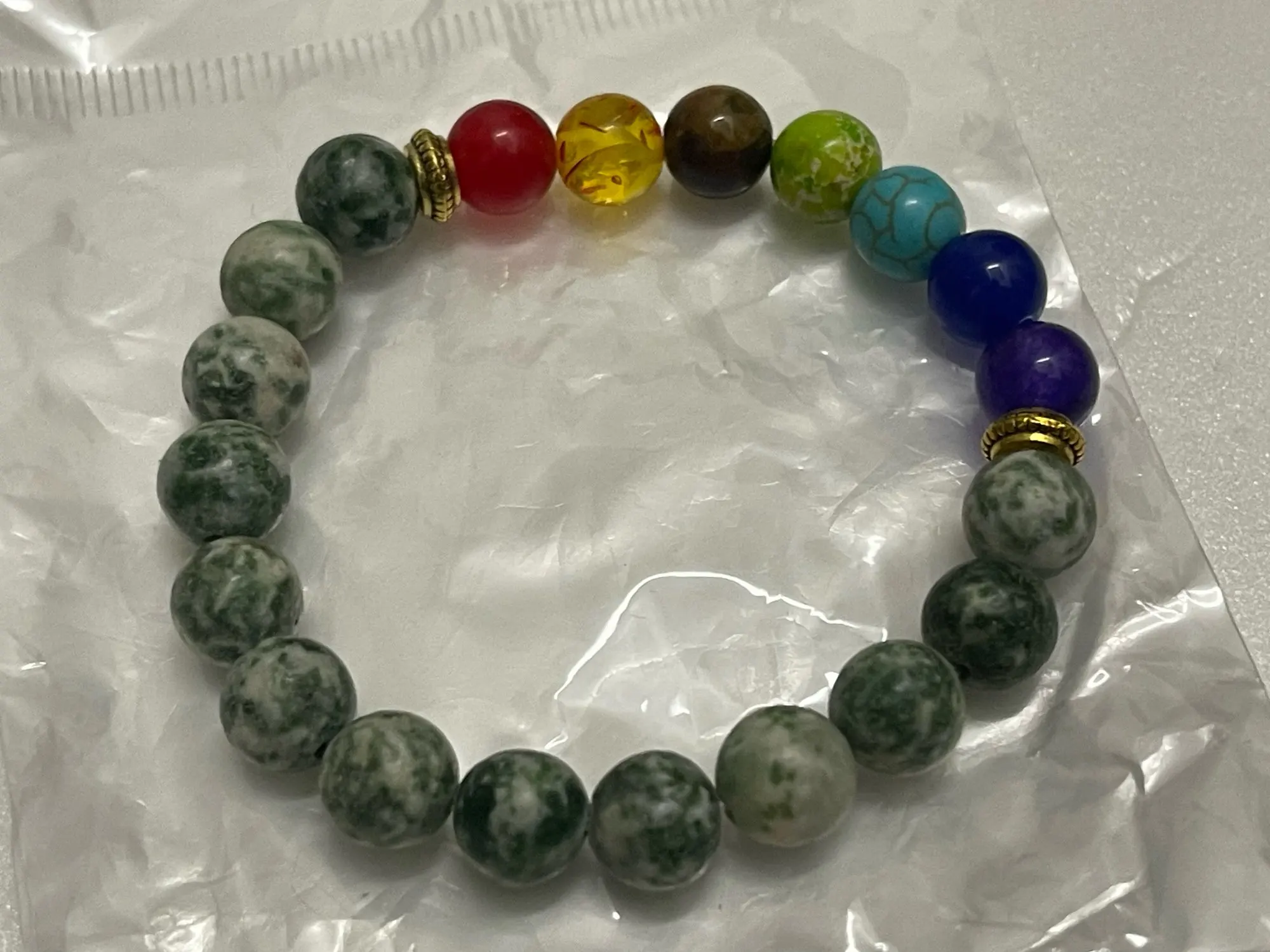 The bracelet features a mix of natural and acrylic stones specifically chosen to represent the seven chakra colors and provide a vibrant aesthetic.