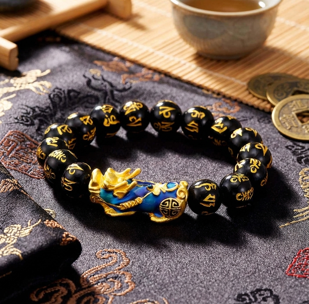 In Chinese tradition, the Pixiu (or Piyao) is a celestial creature known for consuming gold and silver, symbolizing the eternal accumulation of riches and the prevention of financial loss. By combining this auspicious symbol with the protective energy of Black Obsidian and the sacred Mani Mantra, this bracelet creates a harmonious flow of chi to support financial growth, business success, and spiritual well-being.