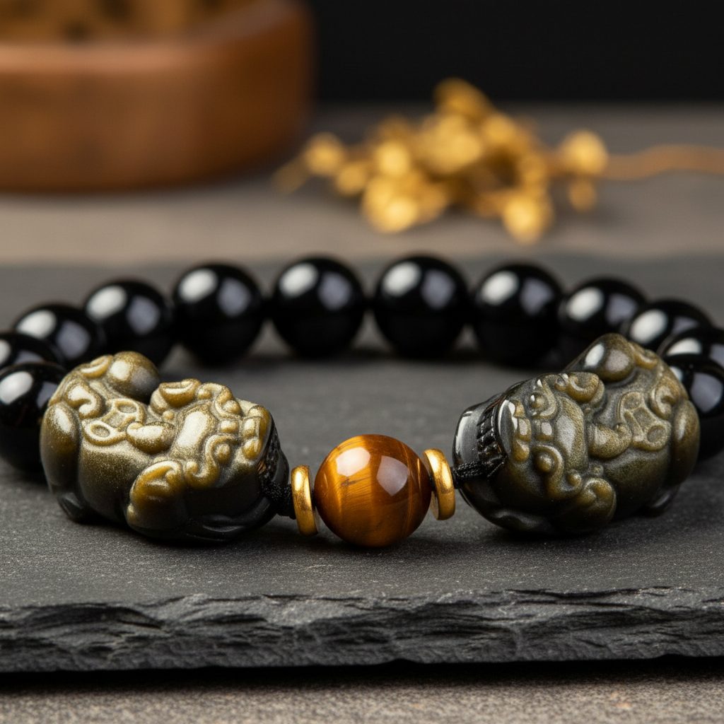 the gold obsidian catches the light beautifully, and having two pixiu makes it feel extra special. really impressed with the stone quality for the price.