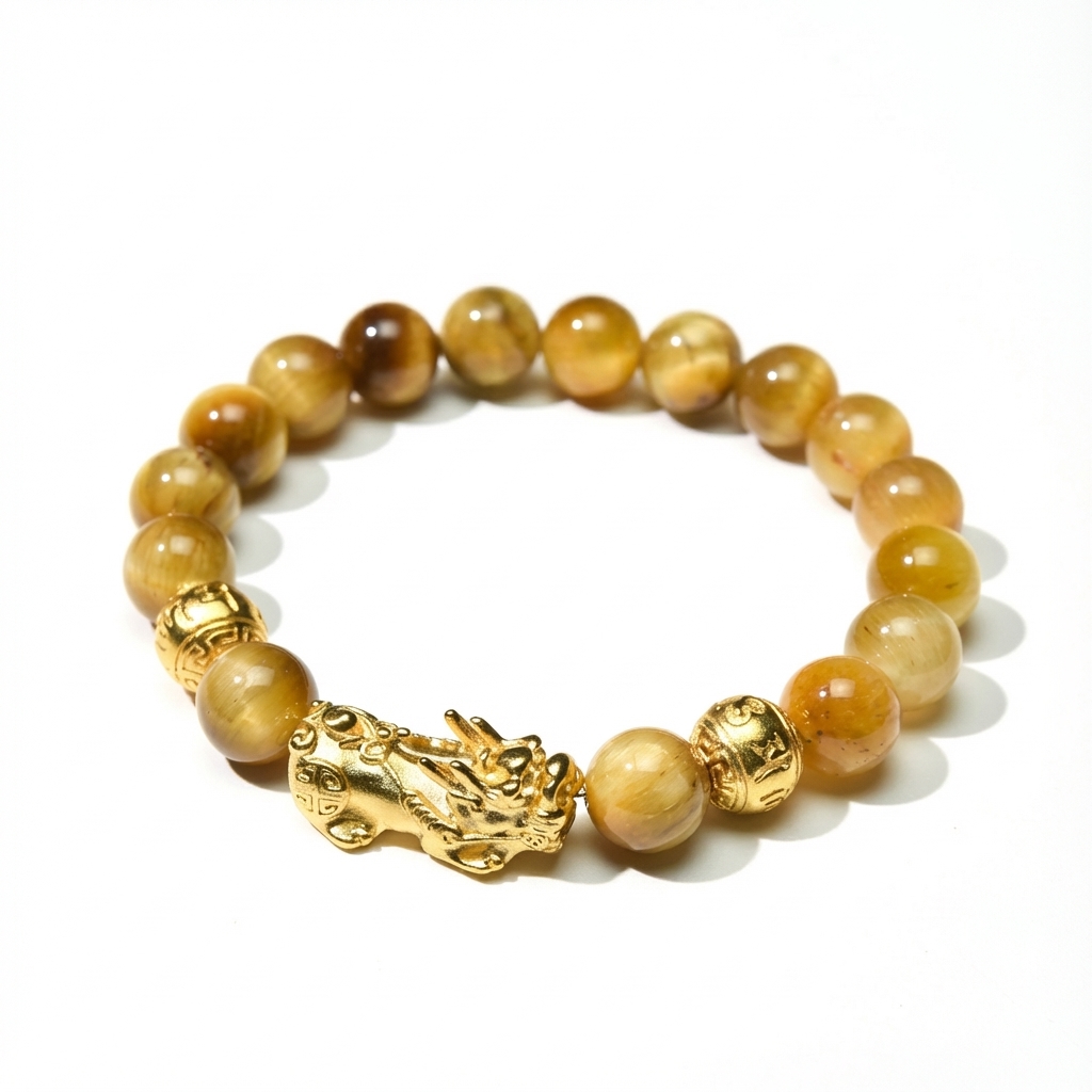 In traditional Chinese culture, the Pixiu (also known as Pi Yao) is a celestial creature revered for its ability to hunt for gold and silver and bring it back to its master. Because the Pixiu has no exit for wealth to leave its body, it symbolizes the protection of fortune and the prevention of financial loss. Paired with Gold Tiger Eye, a stone that resonates with the Earth element and the Solar Plexus chakra, this bracelet enhances your inner strength and mental clarity. The golden chatoyancy of the beads mimics the watchful eye of the tiger, providing a protective shield against the “Evil Eye” and negative intentions from others.