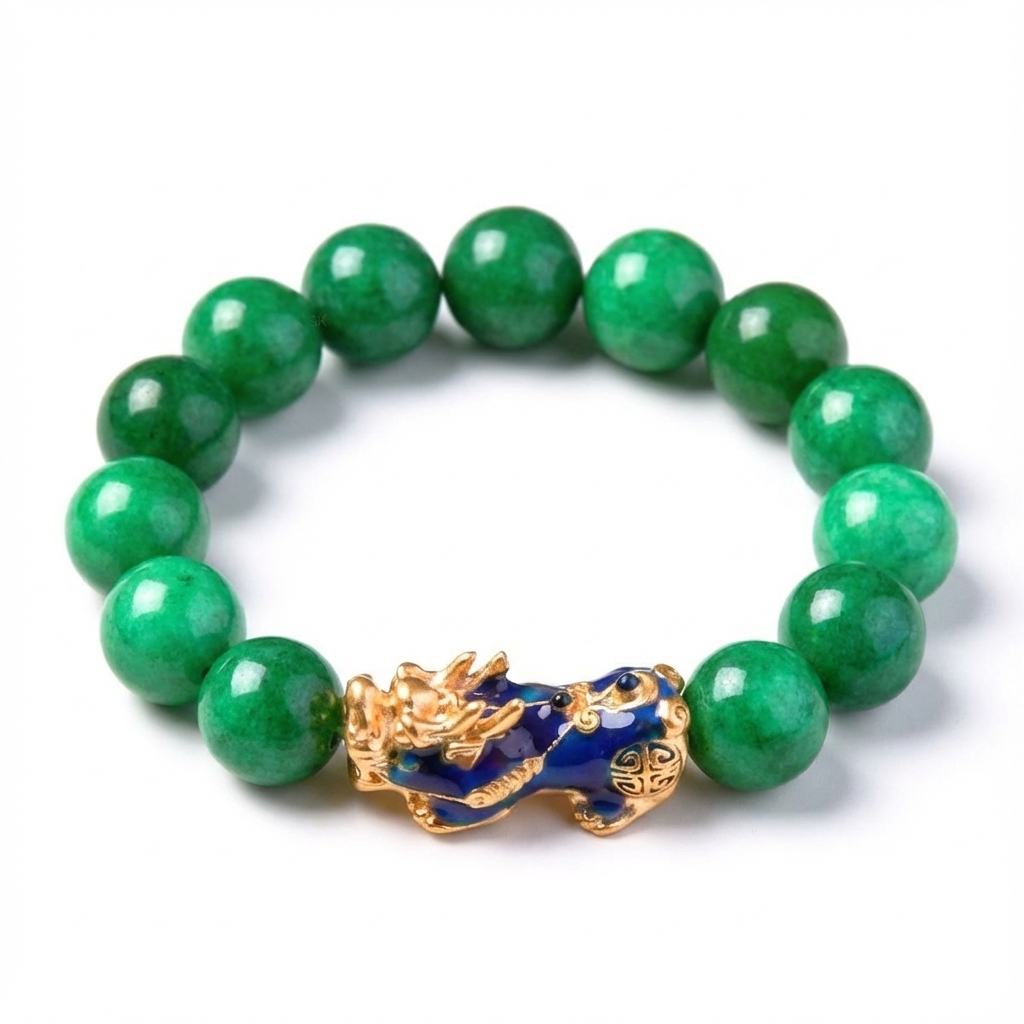 In traditional Chinese culture, Green Jade is revered as the “Stone of Heaven,” symbolizing the five virtues of humanity: courage, modesty, justice, compassion, and wisdom. When paired with the Pixiu (or Piyao), the mythical “fortune beast” known for its insatiable appetite for gold and silver, it creates a powerful Feng Shui synergy. This combination is specifically intended to manifest career success and shield the wearer from misfortunes that could deplete financial resources.