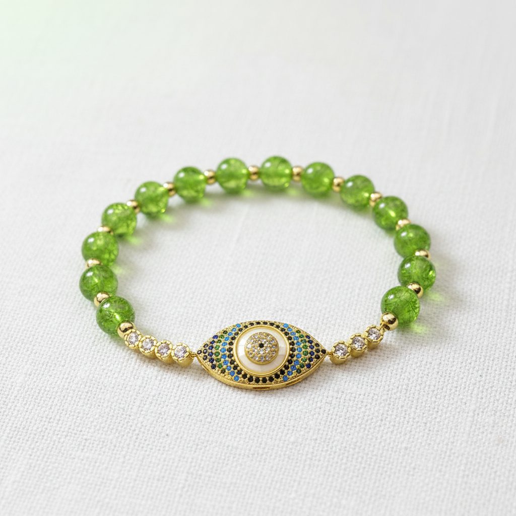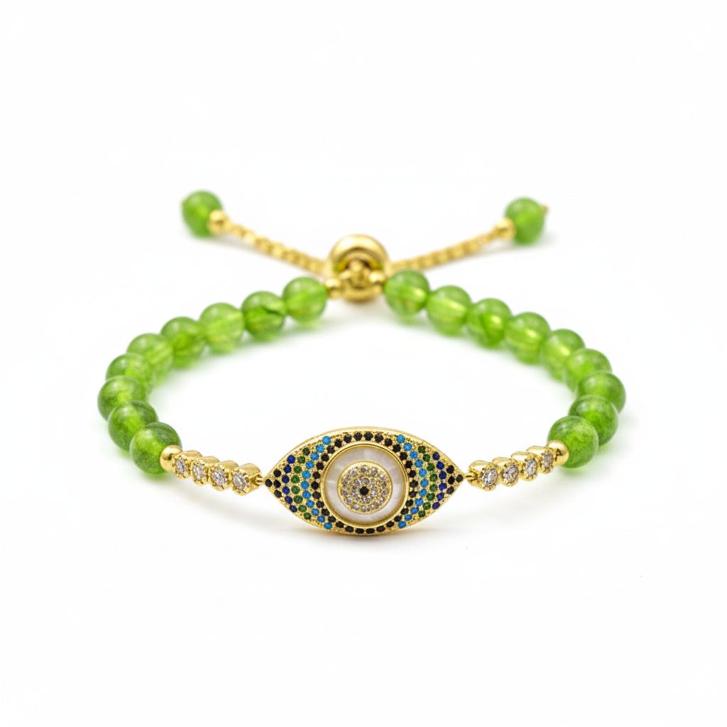 Invite lasting wealth and abundance into your life while shielding yourself from negative vibrations. This exquisite Peridot Evil Eye Bracelet combines the manifestation power of natural gemstones with the ancient protective energy of the ocular amulet, ensuring your path to prosperity remains clear and guarded.