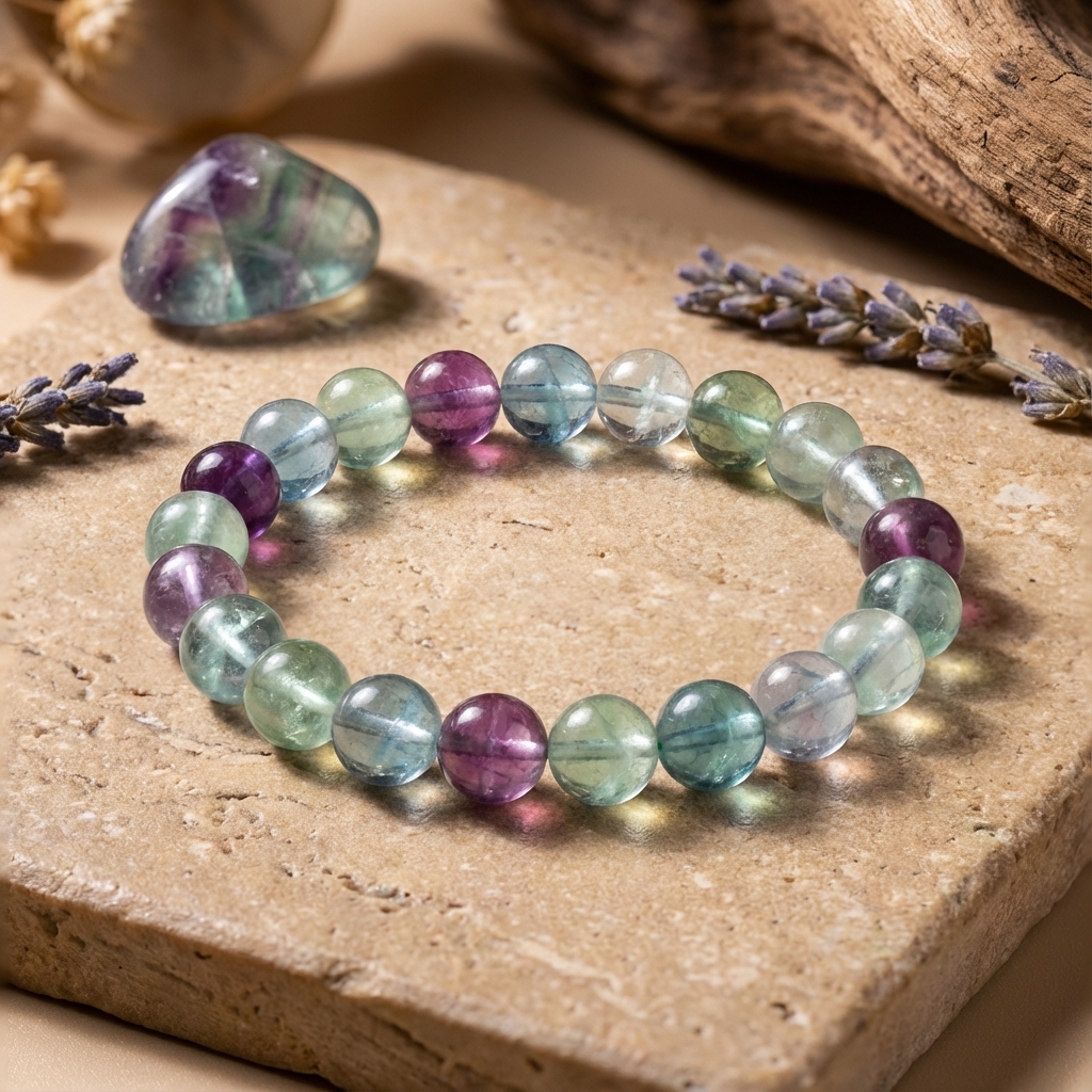In the practice of Feng Shui, Rainbow Fluorite is highly regarded as the “Genius Stone.” It is believed to clear stagnant energy and replace it with a flowing, vibrant aura that promotes wealth and success. By balancing the mind and spirit, it helps the wearer align with the frequency of abundance and protection from mental clutter.