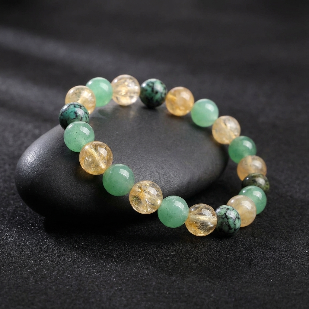 In the practice of Feng Shui, combining specific gemstones creates a potent energetic field to attract positive chi. This bracelet utilizes the “Triple Threat” of wealth stones—Citrine, Green Aventurine, and Turquoise—to clear financial blockages and open doors to new, prosperous opportunities while providing spiritual protection.